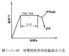 2、低溫退火。低溫退火的目的是使鑄件基體中珠光體的Fe3C發(fā)生石墨化分解,以獲得鐵索體基體的球墨鑄鐵,提高其塑性和韌性。低溫退火的過程是將鑄件加熱到 720-760℃,,保溫一段時(shí)間后隨爐冷至600℃,出爐空冷,見圖 1-3-65。